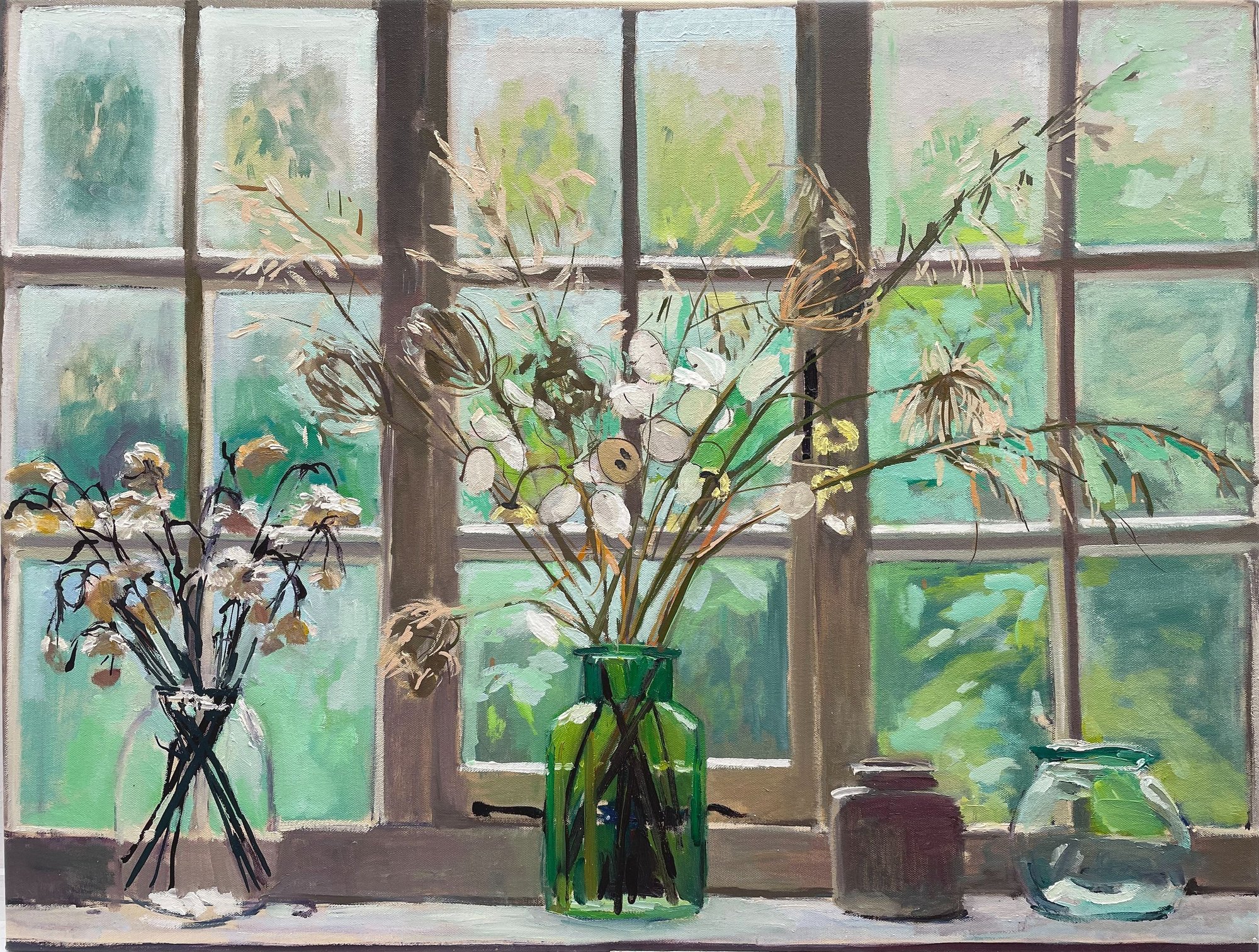 Studio window with Honesty, Daucus, scabiosa, Nigella, Hellichrysum. Oil on Canvas 86cm x 106cm
