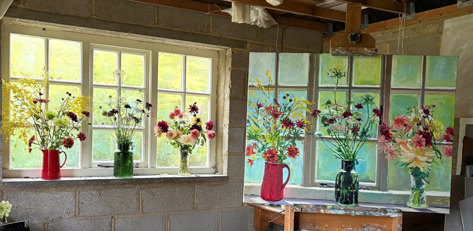 Studio Window with October Flowers. Oil on linen canvas. 100cm x 76cm currently drying, to be framed